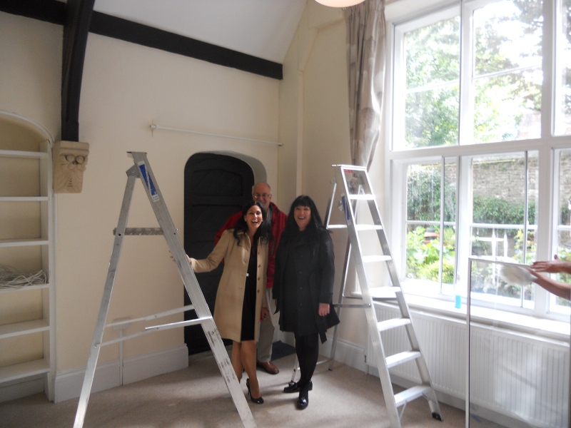 Trustee Ernie Woodford with Rachael Haynes and Helen Lacy of Red Berry Recruitment Ltd, supporters of the Almshouses, visiting the Bread Room. Red Berry Recruitment Visit – Sep 2015